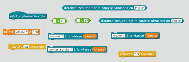 - Si la distance < 10 reculer pendant 0,5s puis tourner à droite pendant 0,5s