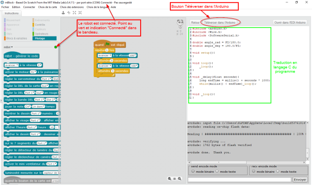 téléverser dans l'Arduino, attendez le codage de votre programme et son transfert dans le robot. Une fois le transfert achevé, il s'exécutera selon vos instructions de programmation ( soit directement, soit par une manipulation sur le robot de votre part).Fenêtre de l'évolution du transfert du programme vers le robot.⚓