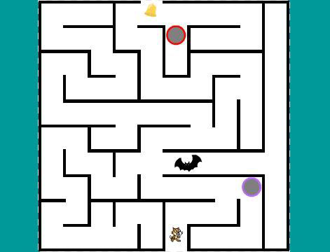 Scratch se retrouve dans le même labyrinthe, mais cette fois une chauve-souris l'empêche de passer. Si Scratch touche la chauve-souris la partie est perdue.