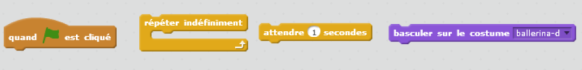 basculer sur le costume...» de la palette «Apparence» (n'oublie pas de cliquer sur le petit triangle noir pour choisir les costumes). Ce bloc peut être utilisé une fois pour chaque costume que tu souhaites faire apparaître (donc plusieurs fois).Tu pourras donc agir sur les différents costumes de la ballerine.