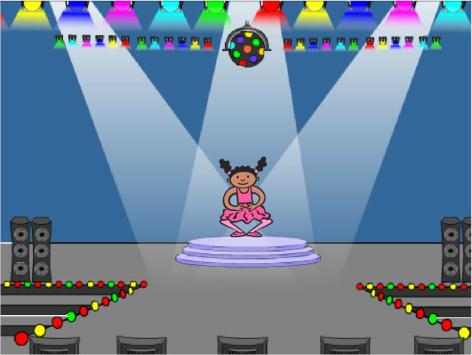 La danseuse attend que tu la programmes pour se mettre à danser. Tu peux commencer par t'aider du projet n°1 « Faire_voler » pour faire une boucle qui affiche les différents costumes de la ballerine.