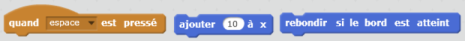 Blocs utiles projet n°9 Dans le premier bloc, clique sur le triangle noir pour sélectionner la « flèche gauche » ou la « flèche droite ». Dans le deuxième bloc, pour changer la valeur de x, soit on ajoutera « 10 » pour le faire grandir et déplacer le lutin vers la droite, soit on indiquera « -10 » pour le faire diminuer et déplacer le lutin vers la gauche.