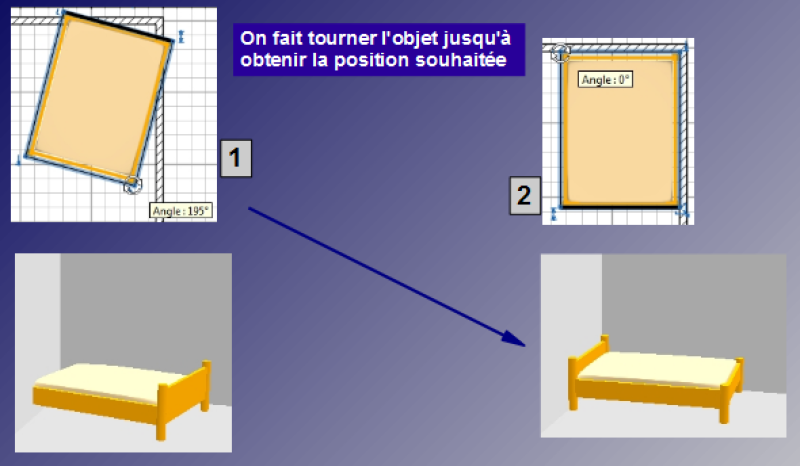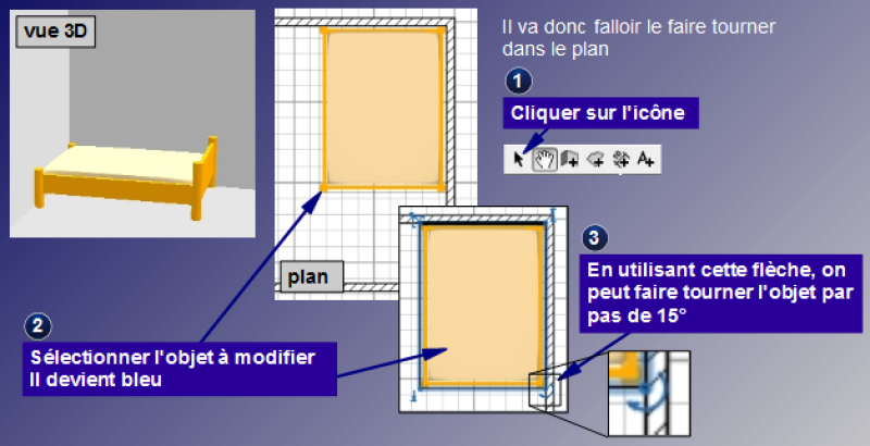 On peut voir dans la vue 3D que le lit n'est pas correctement tourné