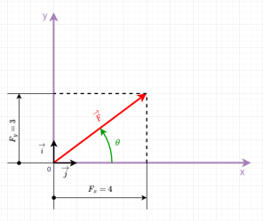 Équation en notation Latex : \left\| \overrightarrow{F}\right\| = F = \sqrt{4^2 + 3^2} = 5