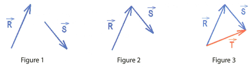 Pour réaliser la somme de Équation en notation Latex : \overrightarrow{R} et de Équation en notation Latex : \overrightarrow{S}, il faut les positionner bout à bout (Figure 2). On relie ensuite l'origine du vecteur Équation en notation Latex : \overrightarrow{R} avec l'extrémité du vecteur Équation en notation Latex : \overrightarrow{S}, on obtient alors le vecteur Équation en notation Latex : \overrightarrow{T} (Figure 3). On a la relation suivante :
