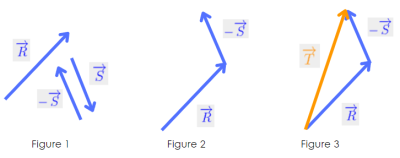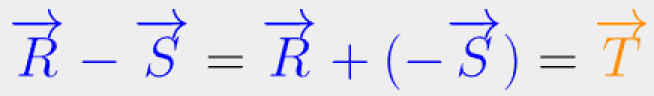 La différence entre les vecteurs Équation en notation Latex : \overrightarrow{R} et Équation en notation Latex : \overrightarrow{S} se ramène à une addition en ajoutant le vecteur opposé (-Équation en notation Latex : \overrightarrow{S}).