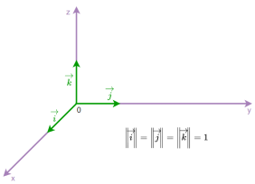 Les vecteurs Équation en notation Latex : \overrightarrow{i}, Équation en notation Latex : \overrightarrow{j} et Équation en notation Latex : \overrightarrow{k} sont des vecteurs unitaires d'intensité égale à 1.
