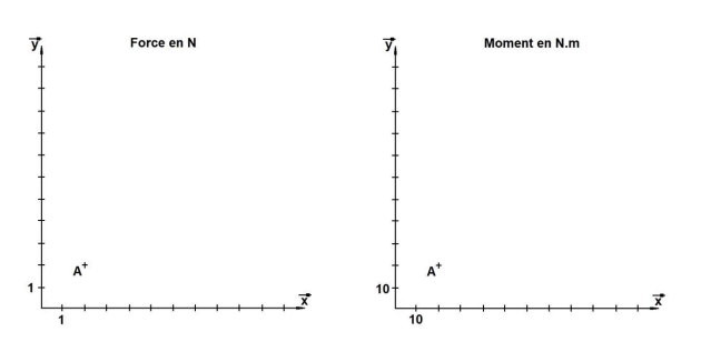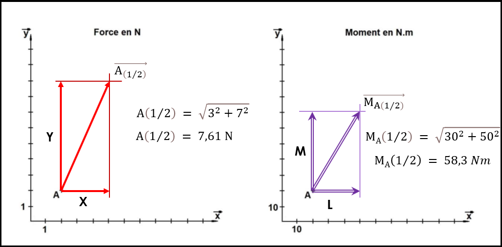 Schématiser par des vecteurs ce torseur dans les repères ci-dessous (composantes et résultantes), puis calculer les valeurs des résultantes.