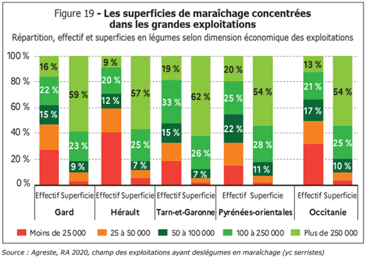 Les petites exploitations (micros et moins de 50 000€ de potentiel économique sont très présentes dans le Gard et l’ Hérault (majoritaire en effectif). En revanche les superficies de légumes sont concentrées dans les grandes (plus de 100k€) dans tous les départements (84 % au niveau régional).