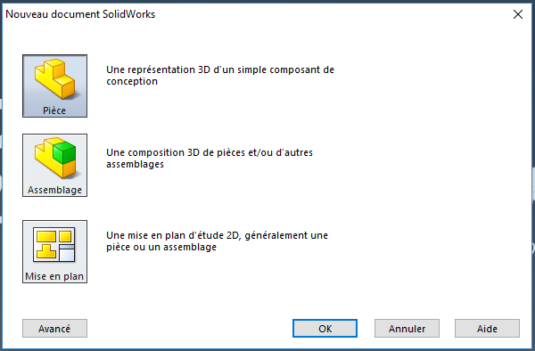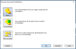 Accès au mode pièce de SolidworksLancer le logiciel en cliquant sur l'icône Pour commencer un nouveau projet, cliquer sur Nouveau Cliquer sur le bouton Pièce puis OK A l'écran apparaît la page de travail de Solidworks.⚓